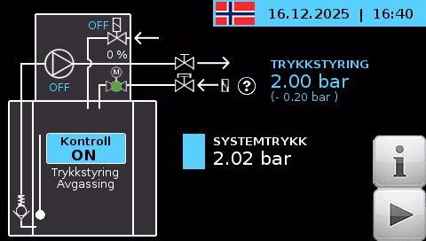 Den viktigste nyheten er en dynamisk, karakteristikkstyrt overløpsventil som muliggjør fullautomatisk drift uten behov for manuell etterkalibrering. Ventilen åpner ved ekspansjon og avgassing og lukker automatisk når ønsket systemtrykk er oppnådd. Alle tilhørende parametere justeres kontinuerlig av styringen, noe som gir minimal trykkdifferanse, høy trykkstabilitet og redusert belastning på systemkomponenter. Ventilen er også utstyrt med mekanisk nødstoppfunksjon som lukker ved strømbrudd.